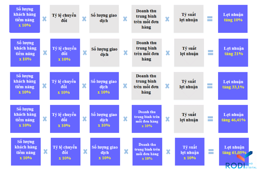 Lợi nhuận = Khách hàng tiềm năng x Tỷ lệ chuyển đổi khách hàng x Giá trị trung bình trên mỗi lần bán hàng x Số lần mua hàng trung bình x Tỷ suất lợi nhuận
